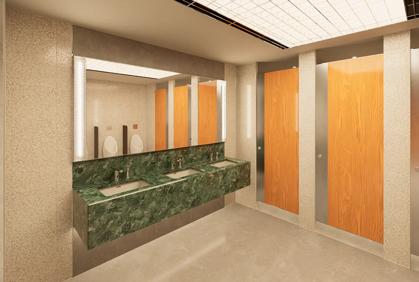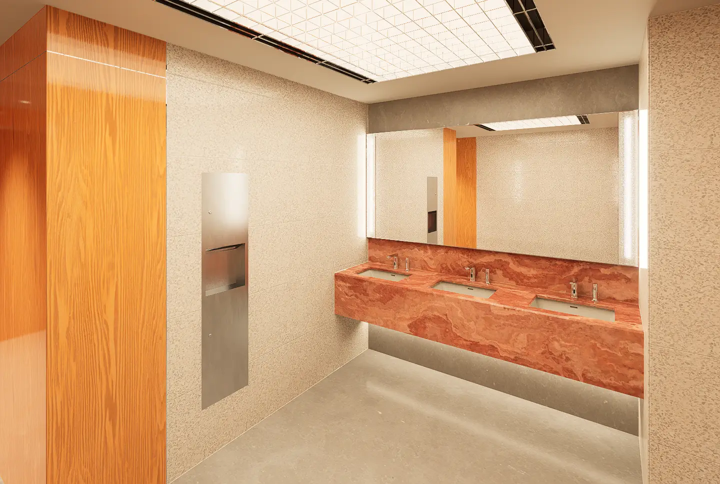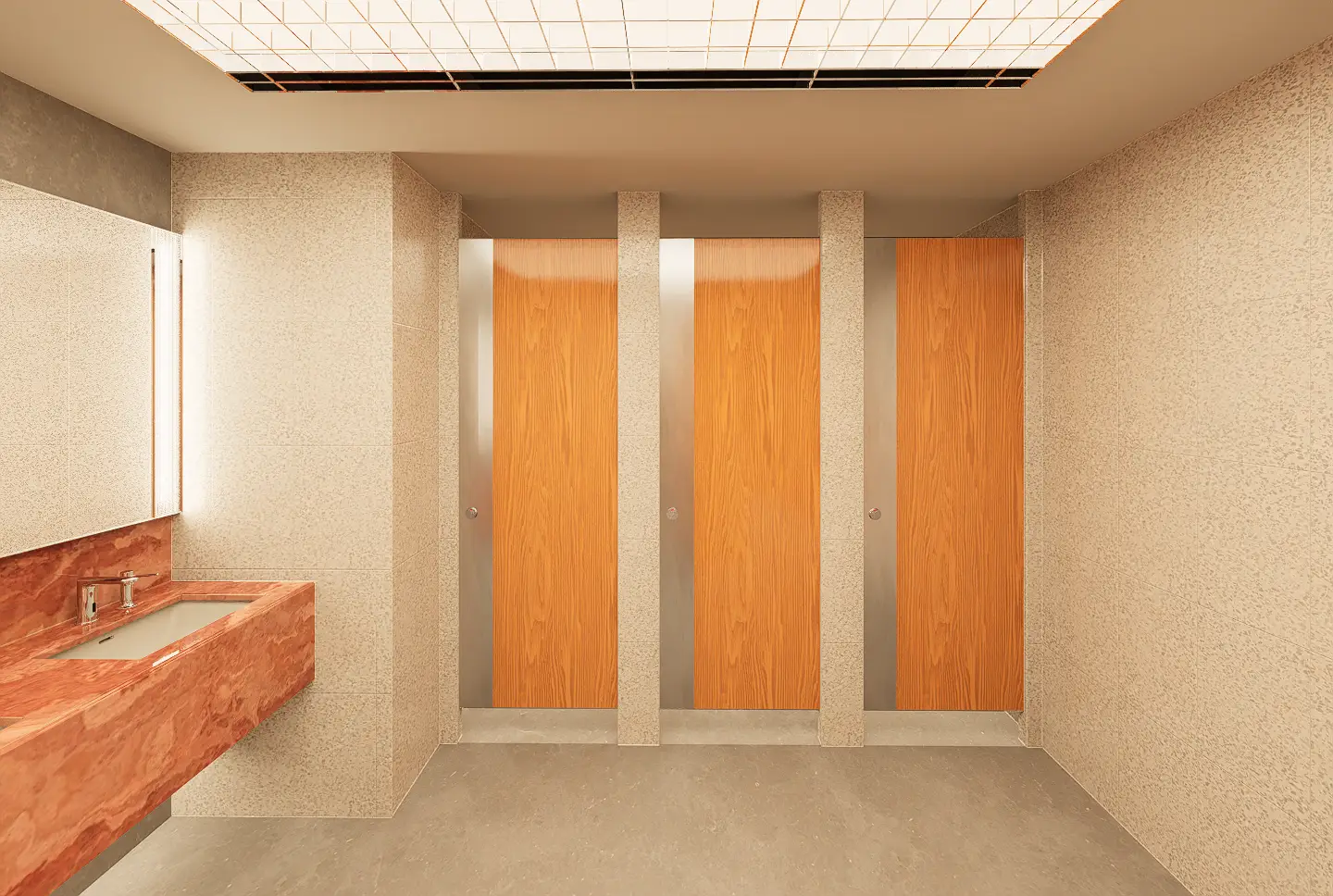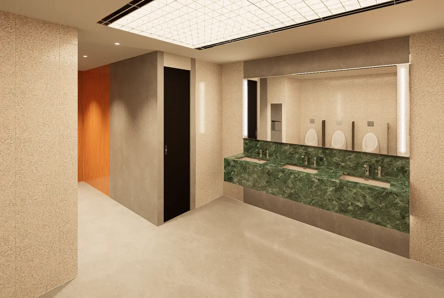 Fresh elements include the use of an acrylic grid ceiling below plane lighting, introducing a clean, diffuse glow, and patterned glass panels placed in front of tube lights around the mirror areas, adding visual depth and texture. Gender identity is subtly reinforced through green tones in the men’s rooms and red tones in the women’s, reflecting the original design cues. An ablution space is also provided, concealed behind a dark etched glass sliding door that opens with a wave sensor—ensuring privacy, ease of use, and a seamless integration into the overall design.