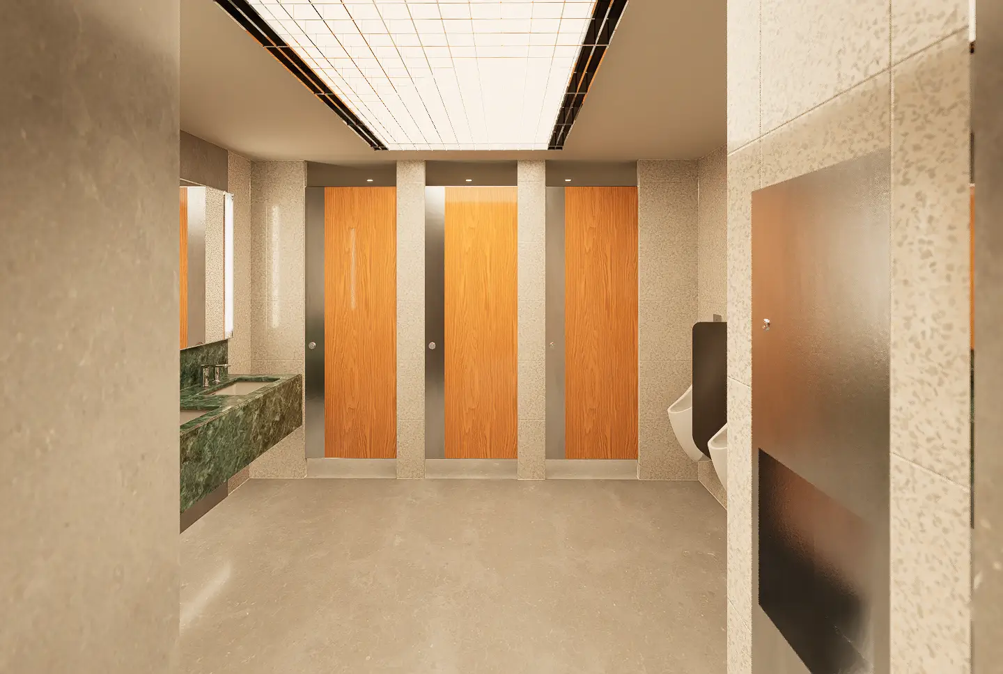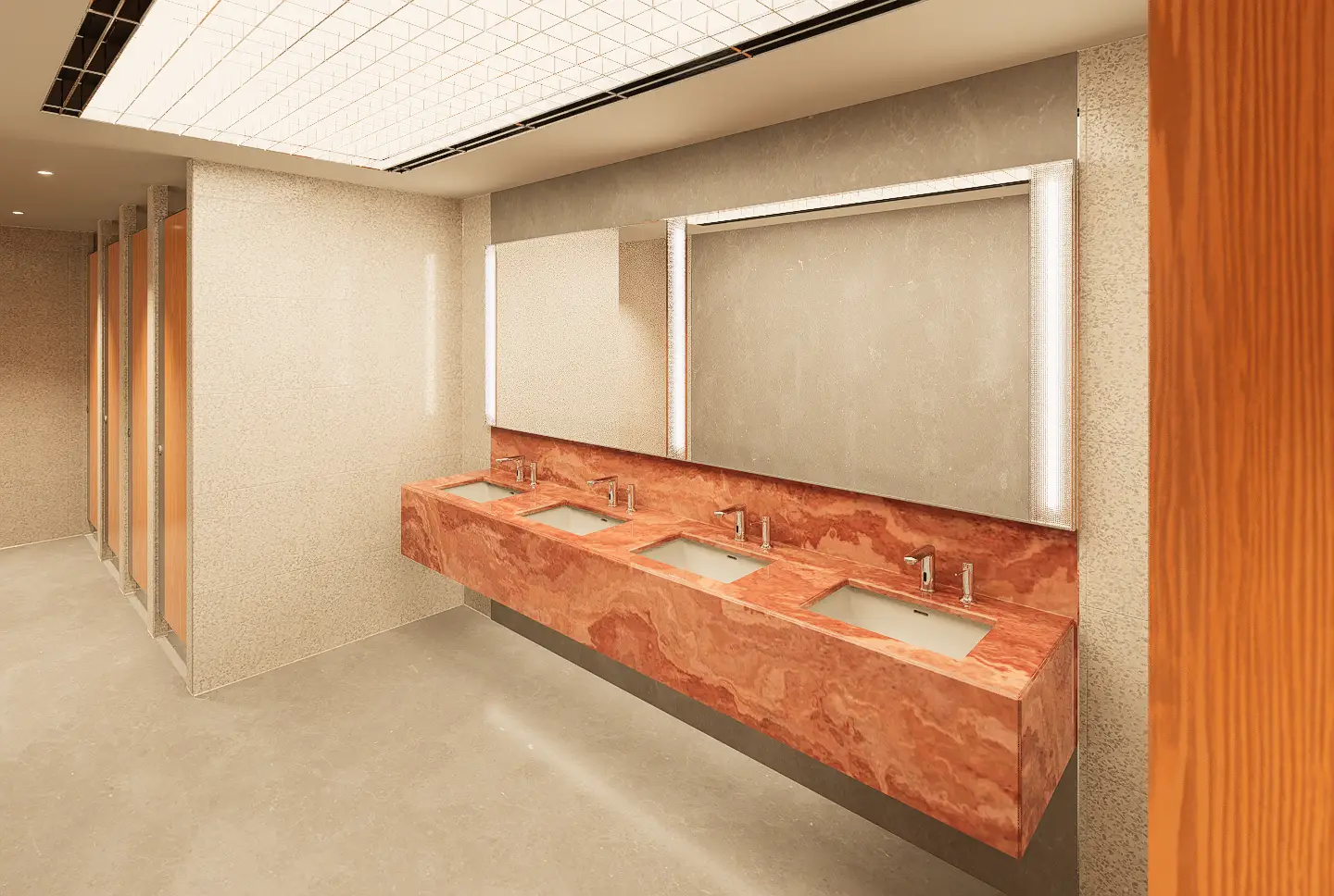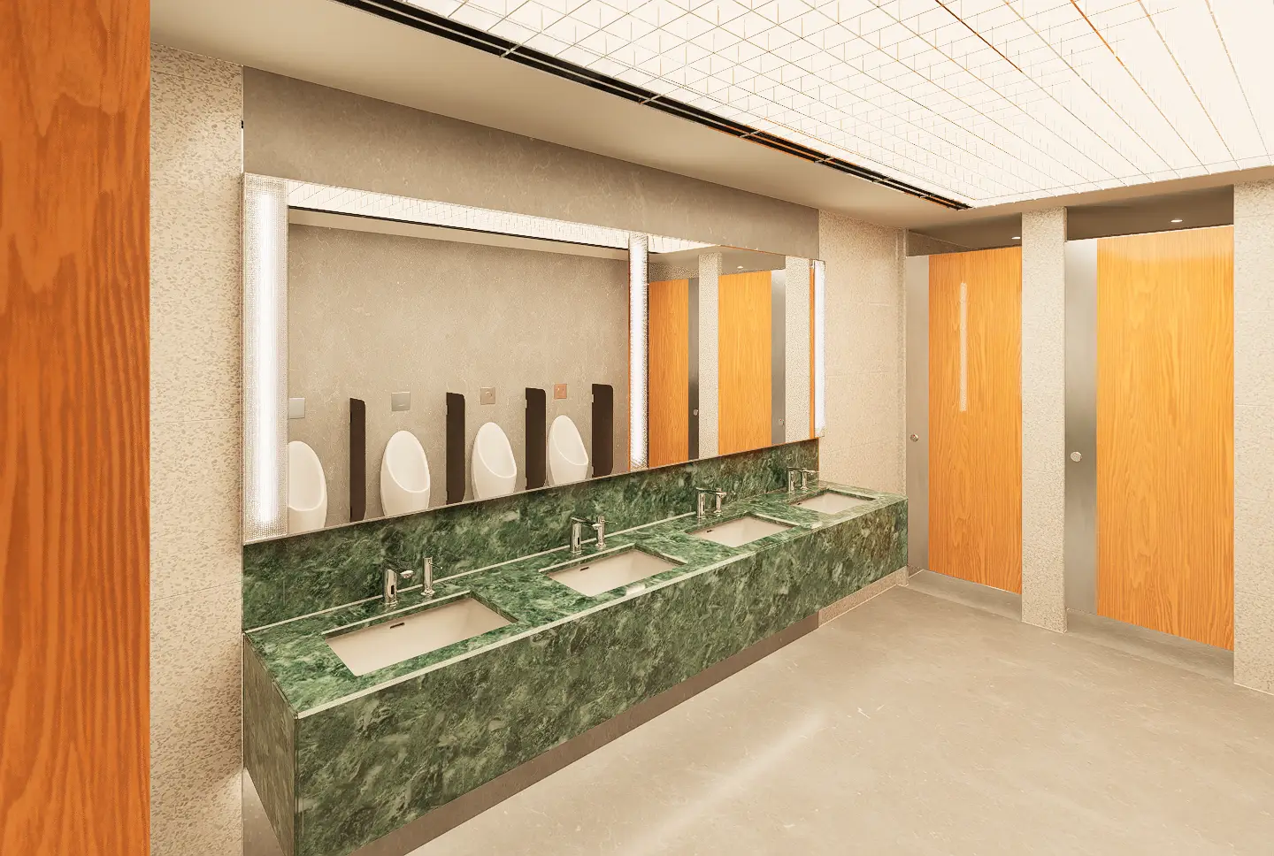 Fresh elements include the use of an acrylic grid ceiling below plane lighting, introducing a clean, diffuse glow, and patterned glass panels placed in front of tube lights around the mirror areas, adding visual depth and texture. Gender identity is subtly reinforced through green tones in the men’s rooms and red tones in the women’s, reflecting the original design cues. An ablution space is also provided, concealed behind a dark etched glass sliding door that opens with a wave sensor—ensuring privacy, ease of use, and a seamless integration into the overall design.