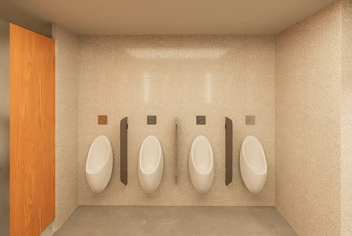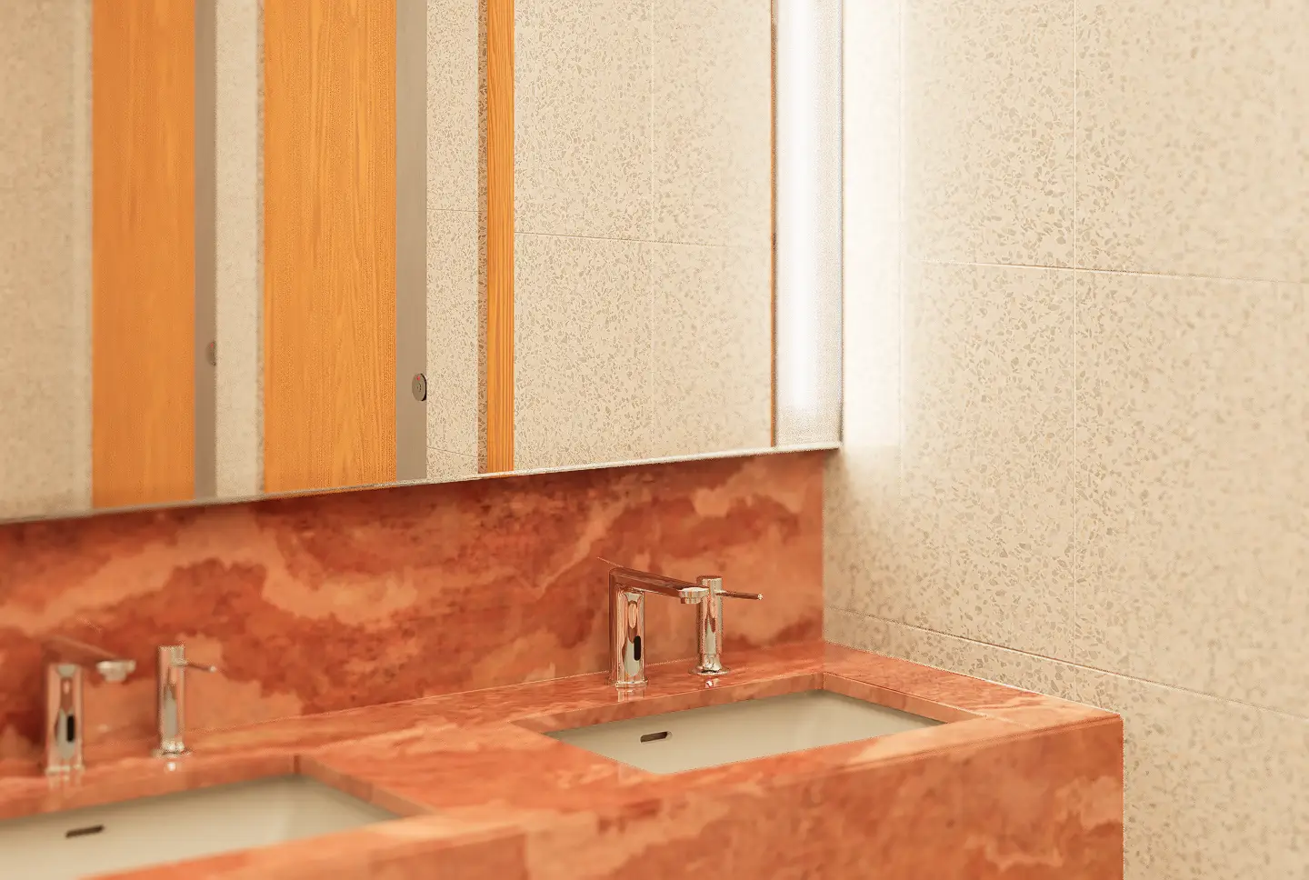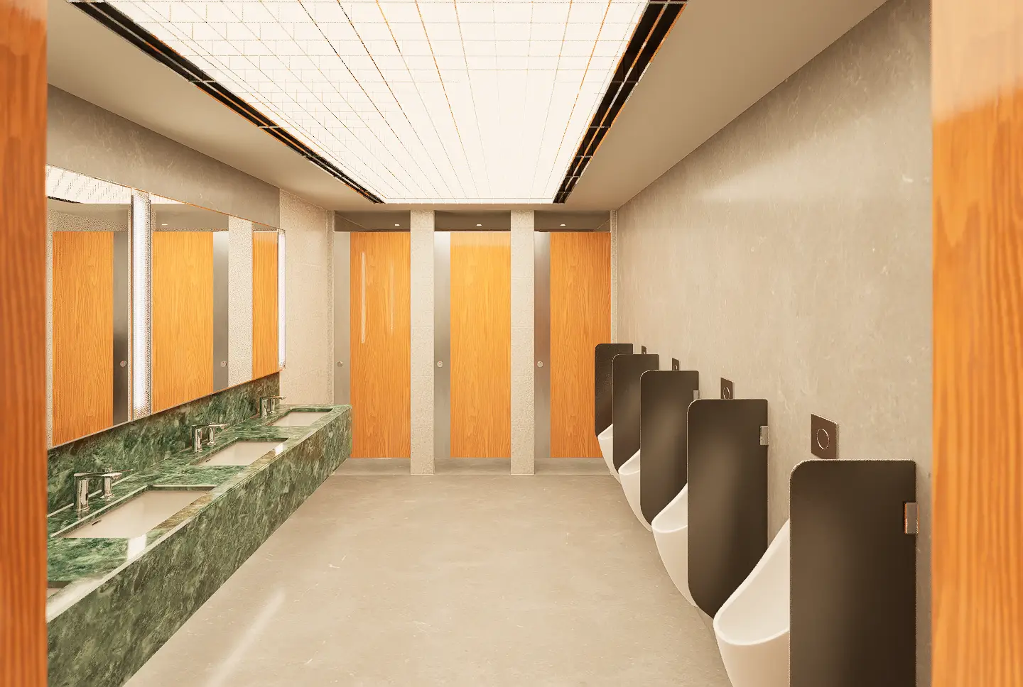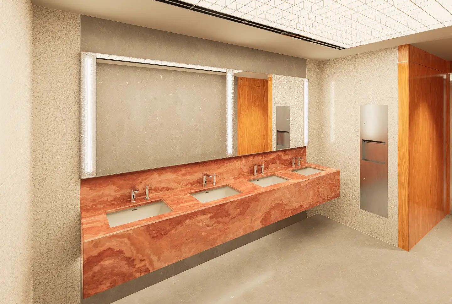 Fresh elements include the use of an acrylic grid ceiling below plane lighting, introducing a clean, diffuse glow, and patterned glass panels placed in front of tube lights around the mirror areas, adding visual depth and texture. Gender identity is subtly reinforced through green tones in the men’s rooms and red tones in the women’s, reflecting the original design cues. An ablution space is also provided, concealed behind a dark etched glass sliding door that opens with a wave sensor—ensuring privacy, ease of use, and a seamless integration into the overall design.