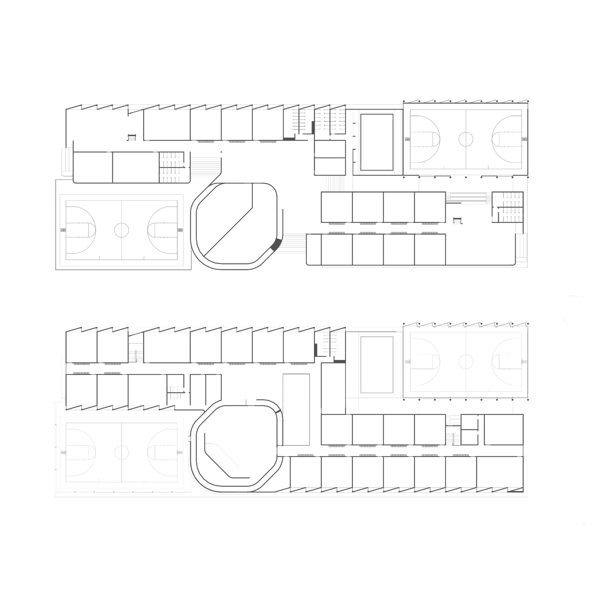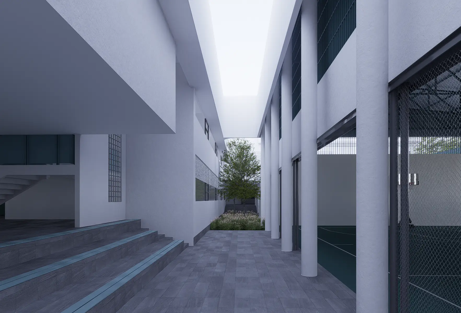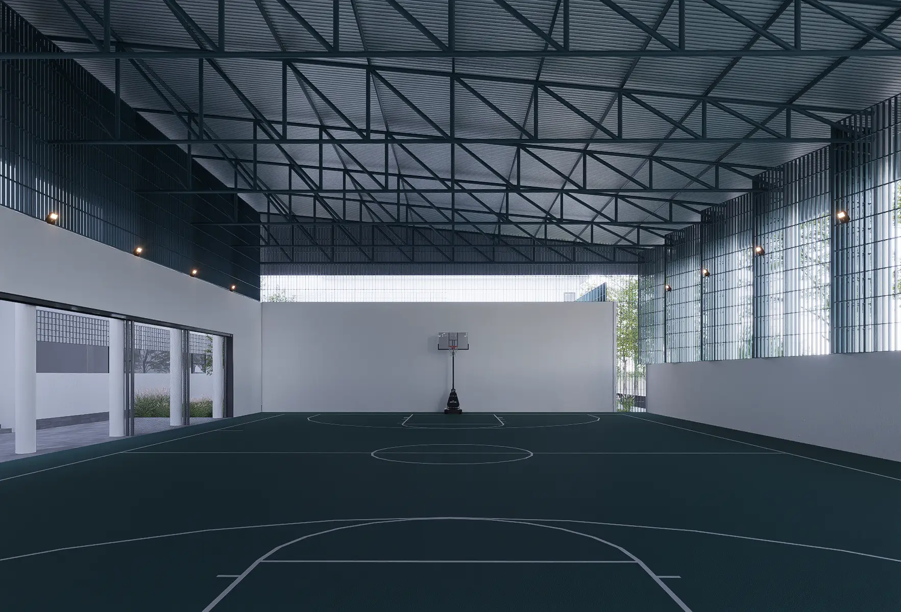 The school also provides two sports fields: one outdoor and one indoor. The outdoor field doubles as a ceremonial plaza for flag-raising and school gatherings, while the indoor court is designed to support various sports activities and competitions, complete with seating for spectators. A swimming pool is also included, with appropriate planning for privacy and safety.