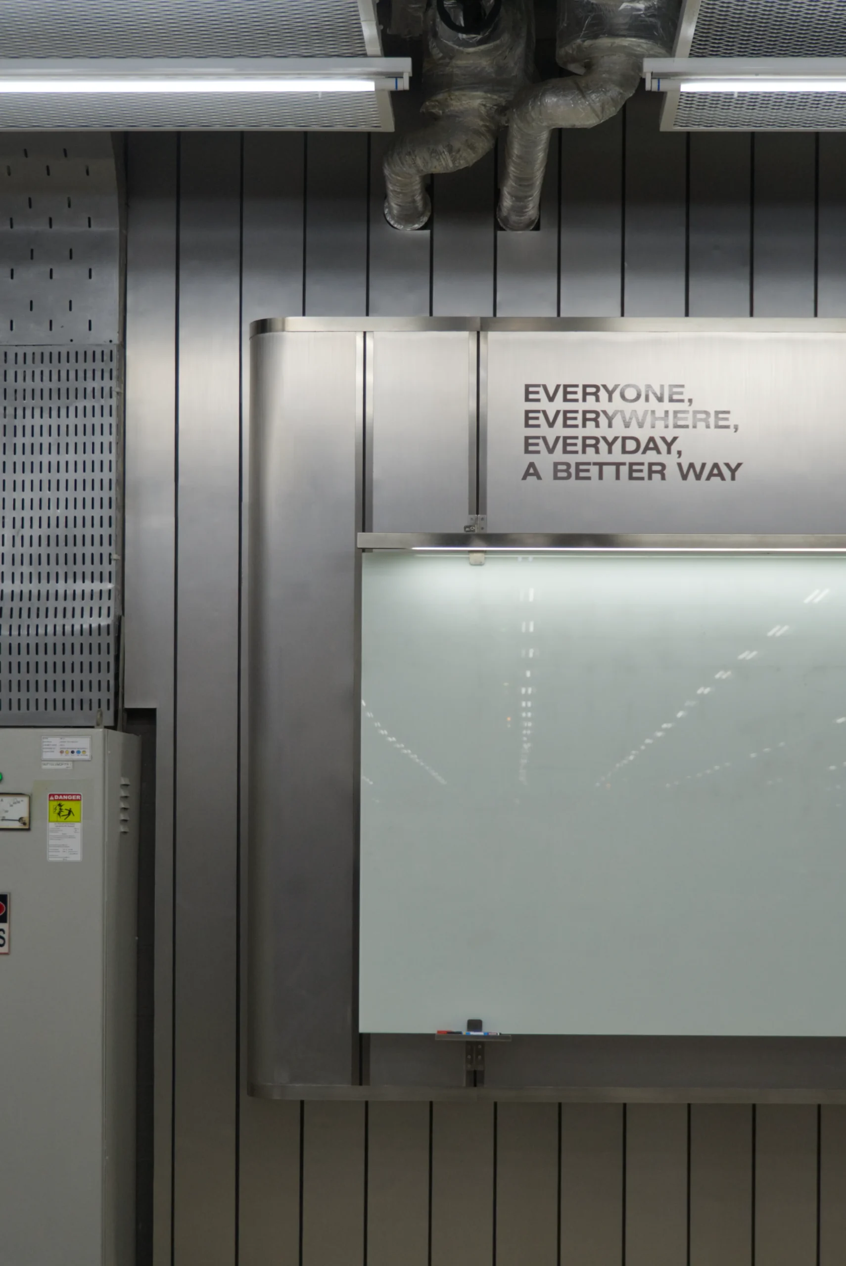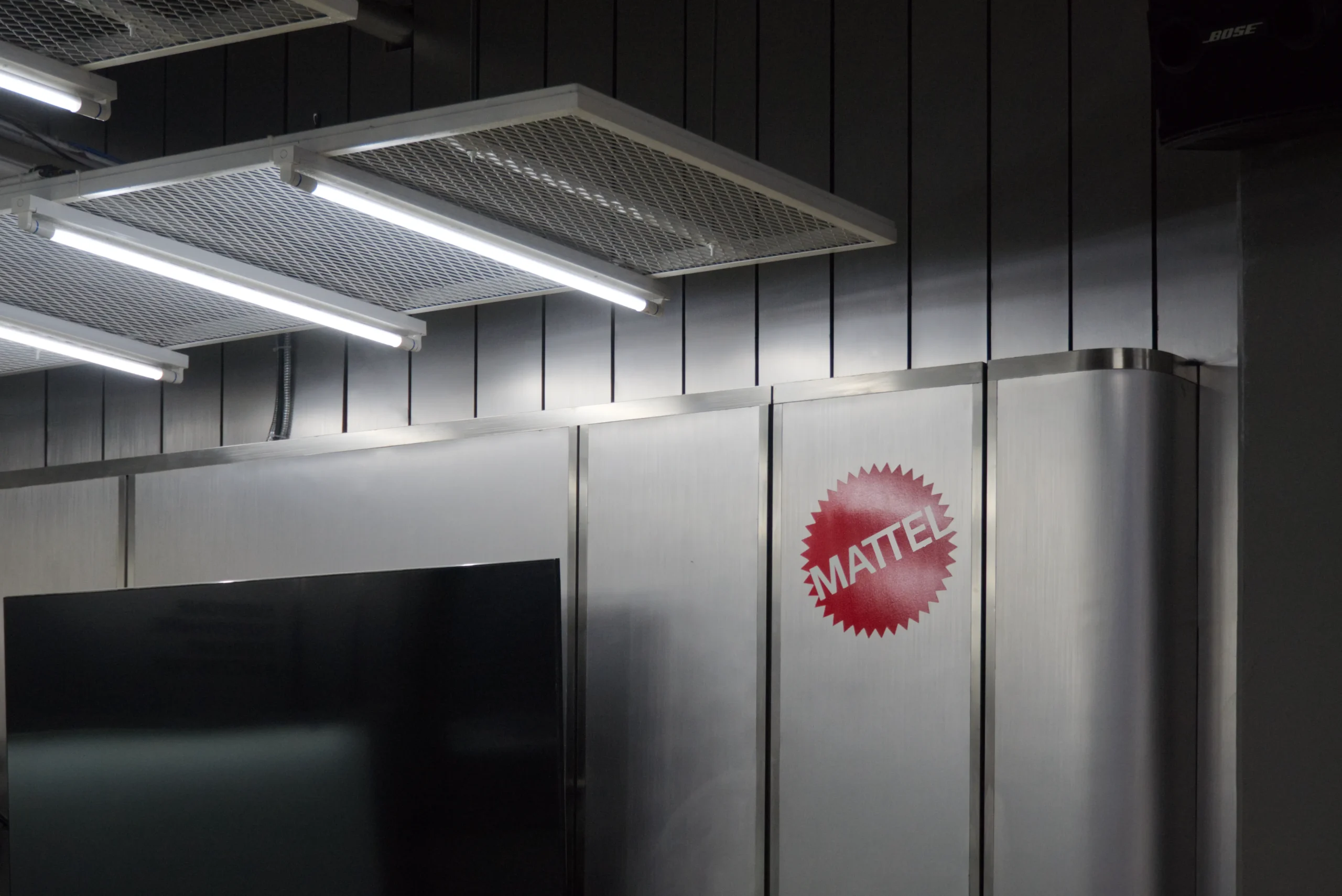 Aesthetically, the space is shaped by a palette of stainless steel finishes and grey metal sidings, carefully selected to echo the industrial context of the factory while introducing a futuristic sensibility. Unexpected curves in the otherwise rigid, rectilinear material language provide a sense of fluidity and sophistication, setting the space apart as a deliberate architectural intervention amid the production floor. The result is a functional yet striking area that supports collaboration, aligns with the factory’s identity, and subtly elevates the daily experience of its users.