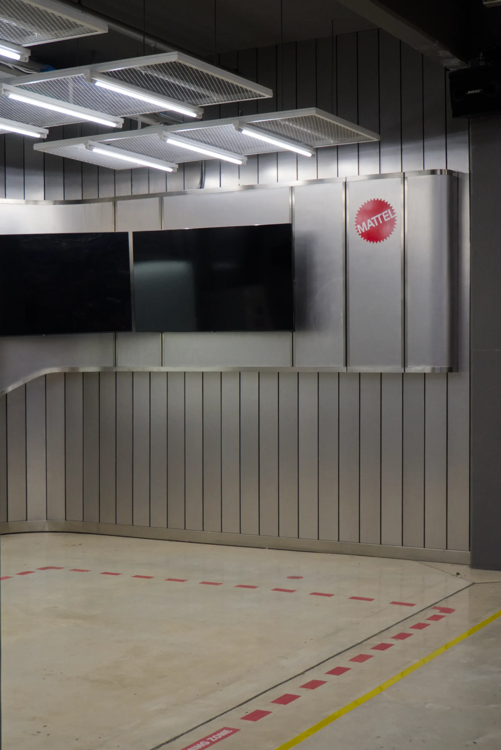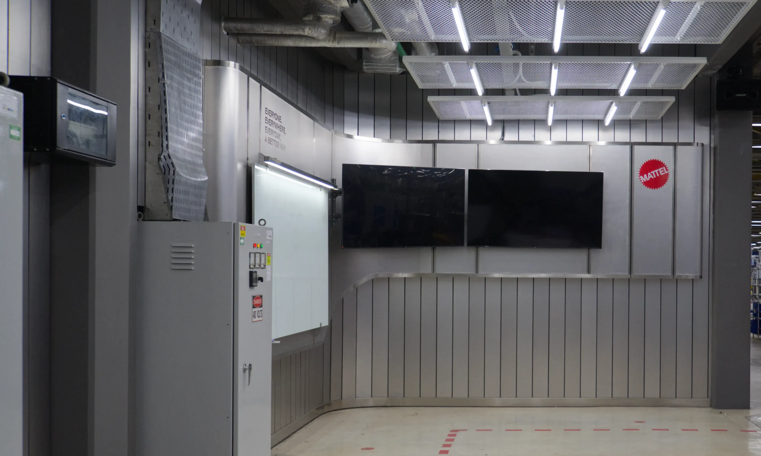 Located within Mattel’s manufacturing facility in Cikarang, this compact interior project transforms a modest two-walled corner into an efficient, high-capacity discussion area. The design accommodates up to 30 people simultaneously, with visual accessibility at its core. A large TV screen is mounted high on one wall, paired with a whiteboard, ensuring unobstructed views for all participants regardless of their position within the space.