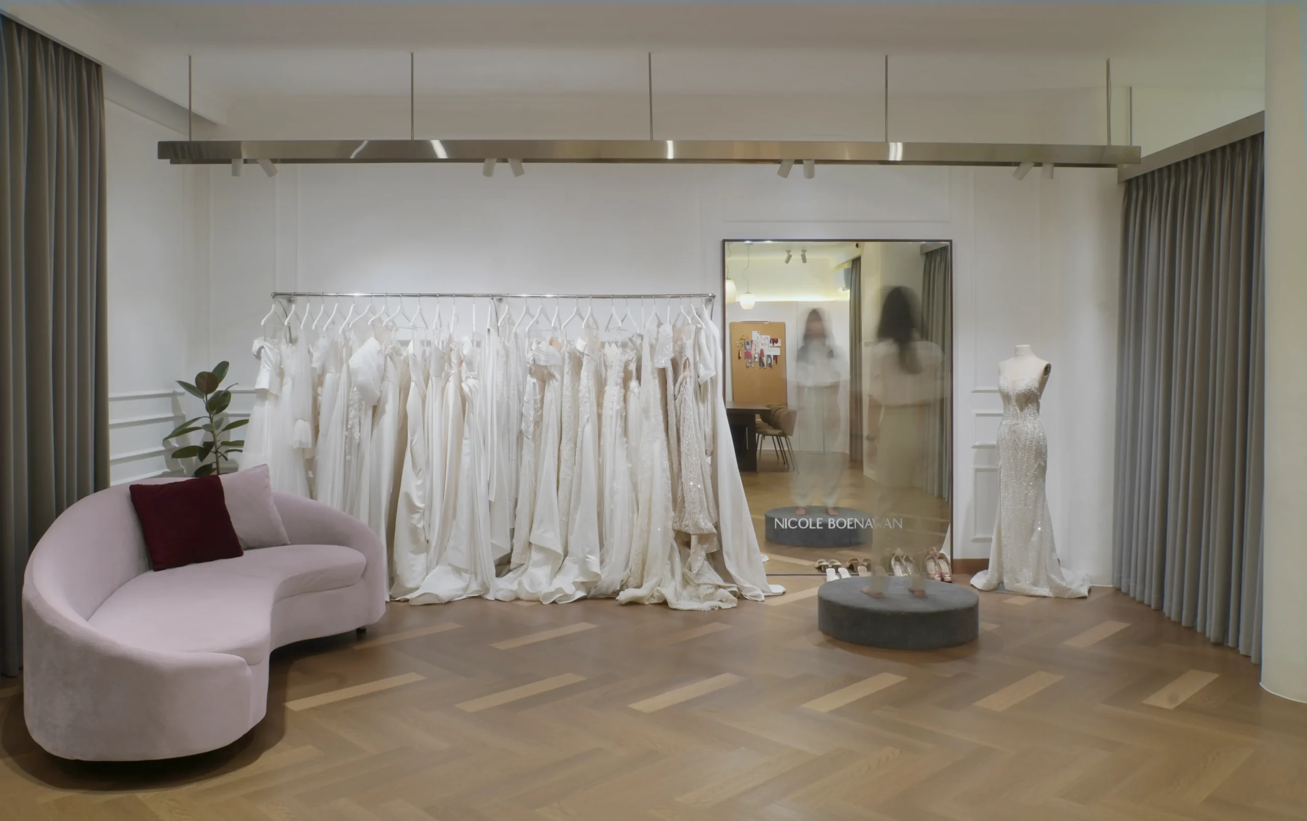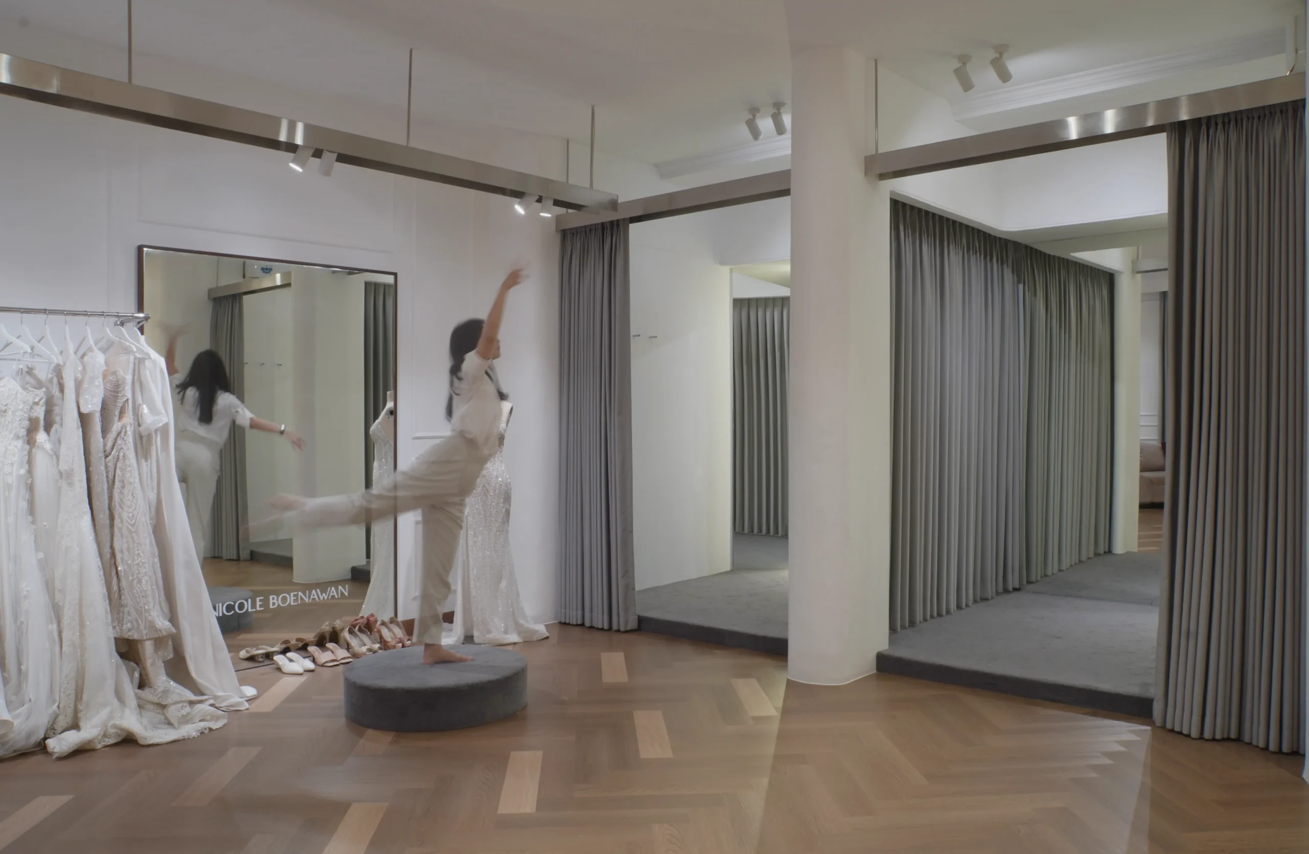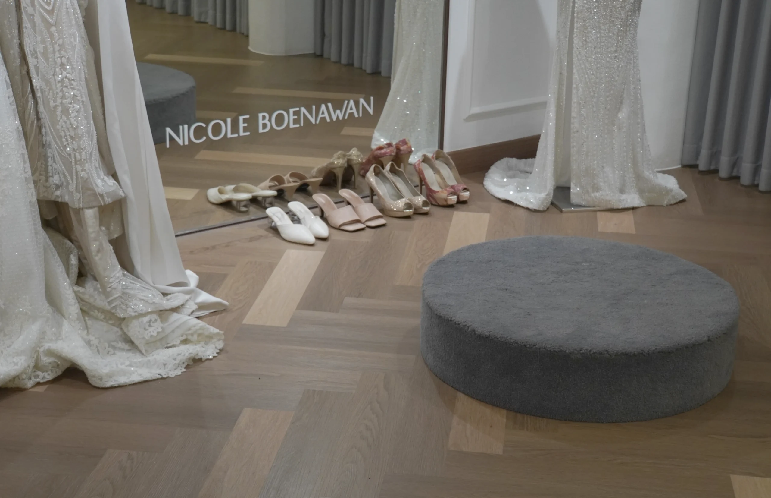 To achieve this, we worked with the existing architecture, repurposing a raised platform area as the foundation for two fitting rooms. These fitting rooms are designed with flexibility in mind—they can be used separately or combined into one larger space to accommodate various appointment needs. Throughout the project, we developed a new visual identity for the brand through a material palette that merges tradition and modernity. Elements like stainless steel introduce a sleek, refined edge, while classic touches such as wainscoting ground the space in timeless elegance.