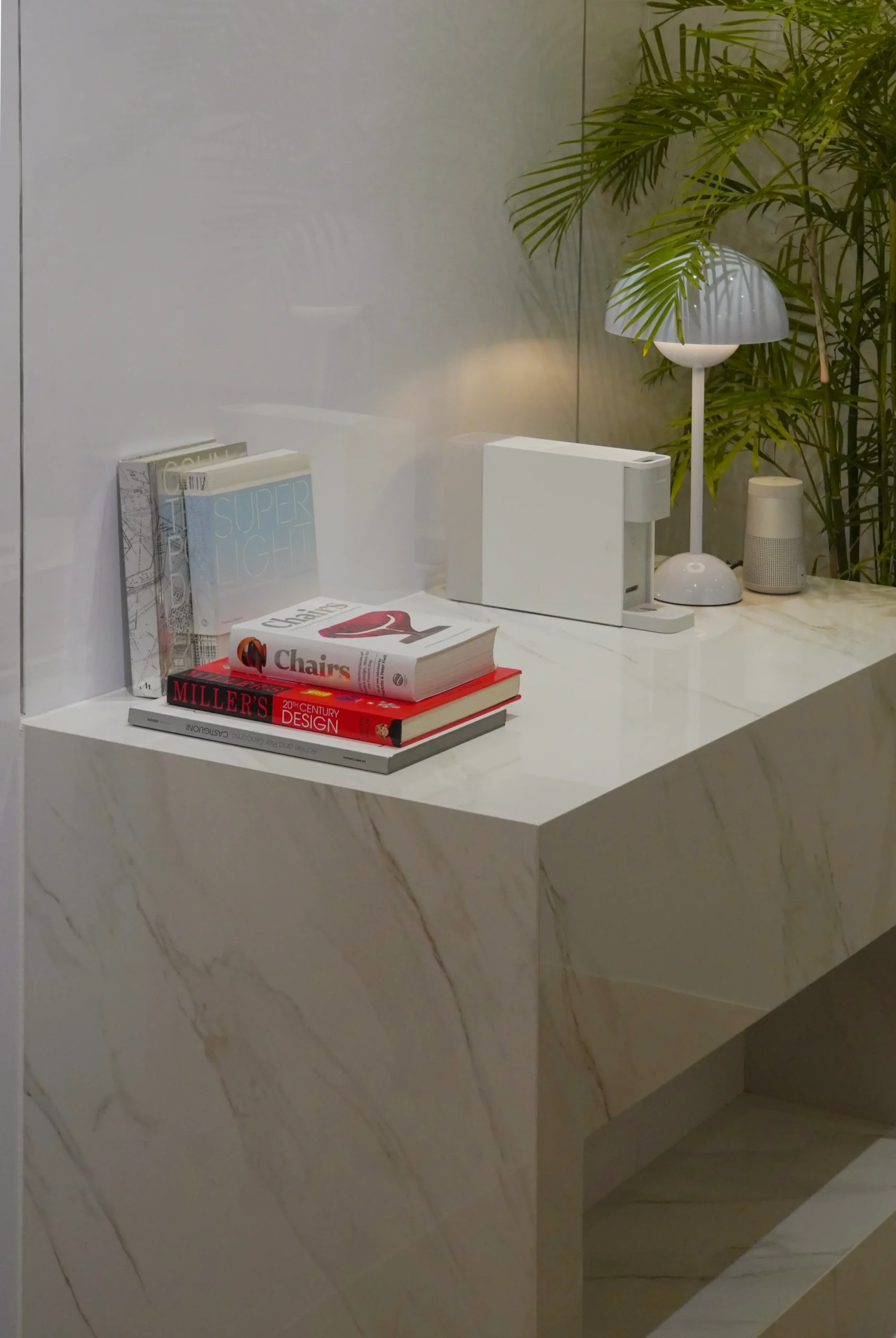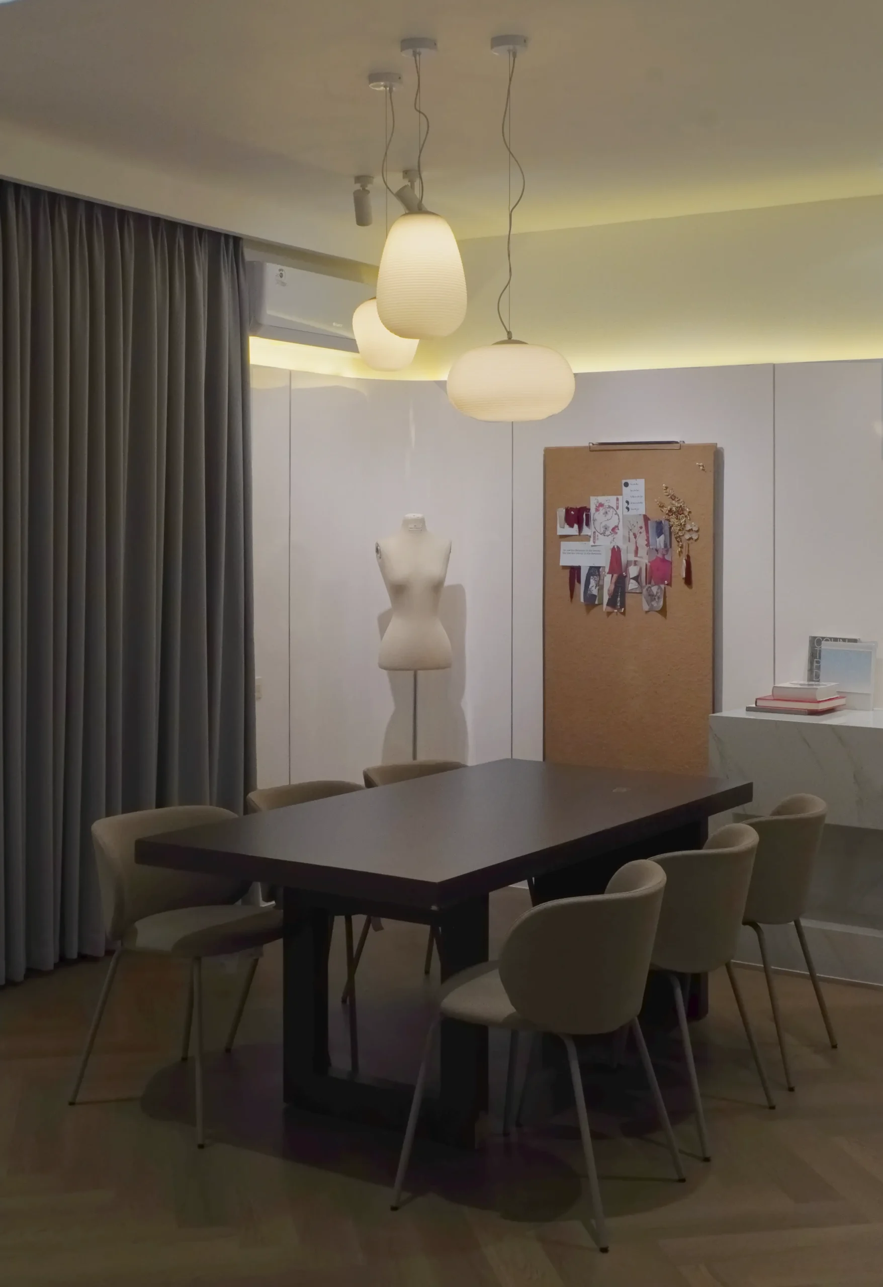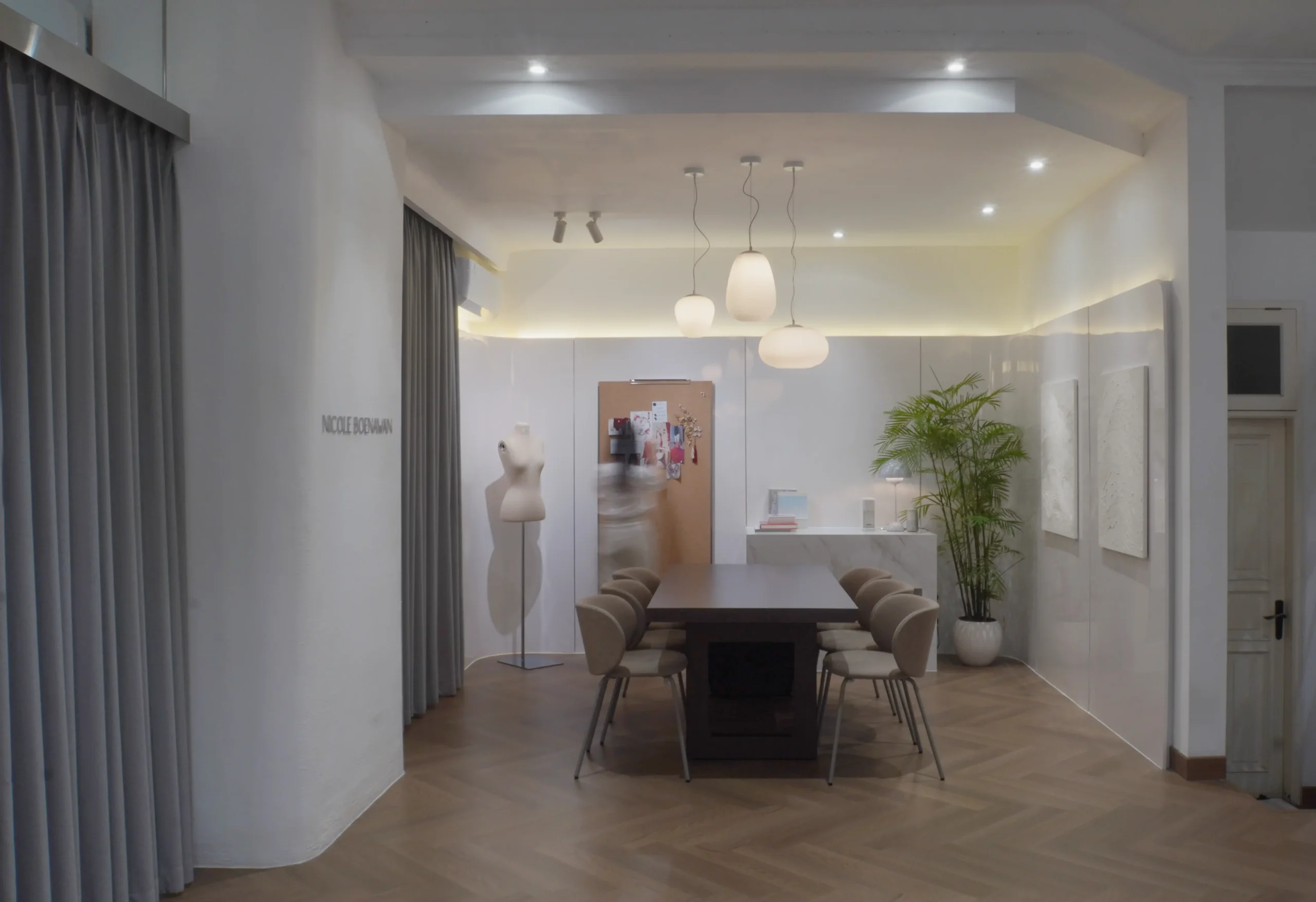 White was chosen as the primary color to evoke a bridal ambiance and allow the vivid tones of the cheongsams to take center stage. To keep the monochromatic scheme rich and layered, we used a variety of white finishes—smooth painted walls, textured surfaces, high-gloss panels in the meeting area, and white marble detailing on furniture. Flowing curtains are strategically placed to conceal doors, further distancing the space from its residential roots. A warm-toned wooden floor with subtly accentuated patterns anchors the showroom and adds contrast, helping define the different zones without rigid separations.